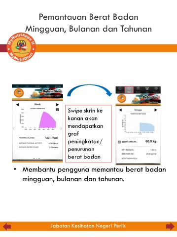 Pemantauan Berat Badan Mingguan, Bulanan dan Tahunan Swipe skrin ke kanan akan mendapatkan graf peningkatan/ penurunan berat badan • Membantu pengguna memantau berat badan mingguan, bulanan dan tahunan. Jabatan Kesihatan Negeri Perlis
