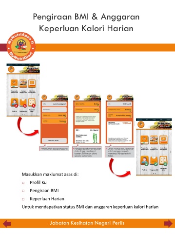 Pengiraan BMI & Anggaran Keperluan Kalori Harian Masukkan maklumat asas di: Profil Ku Pengiraan BMI Keperluan Harian Untuk mendapatkan status BMI dan anggaran keperluan kalori harian Jabatan Kesihatan Negeri Perlis