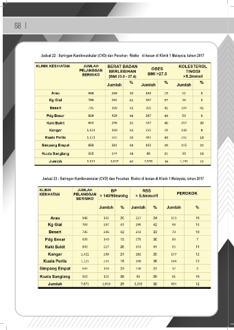 68 | Jadual 22 : Saringan Kardiovaskular (CVD) dan Pecahan Risiko di kesan di Klinik 1 Malaysia, tahun 2017 Jadual 23 : Saringan Kardiovaskular (CVD) dan Pecahan Risiko di kesan di Klinik 1 Malaysia, tahun 2017