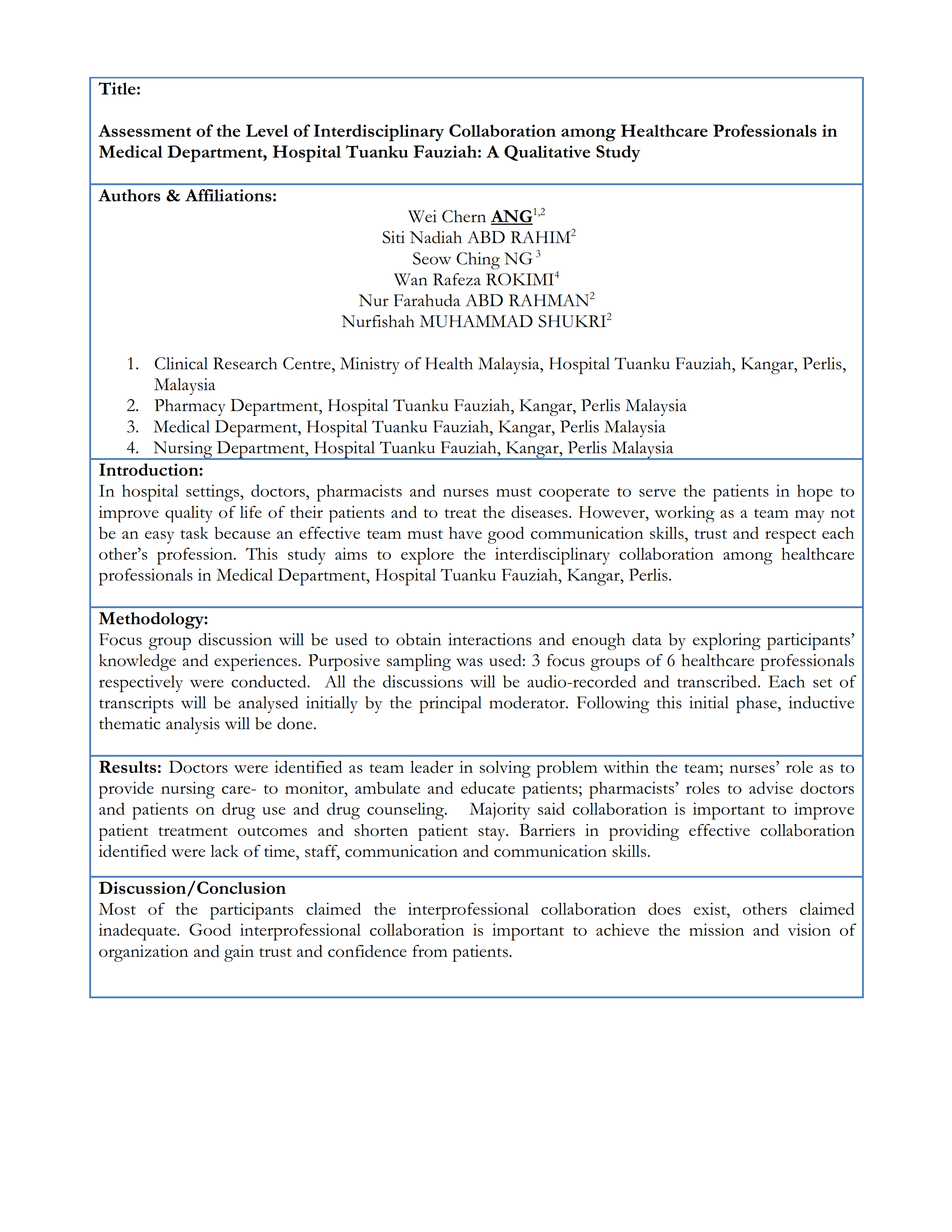 Assessment of the Level of Interdisciplinary Collaboration among Healthcare Professionals in Medical Department, Hospital Tuanku Fauziah : A Qualitative Study |