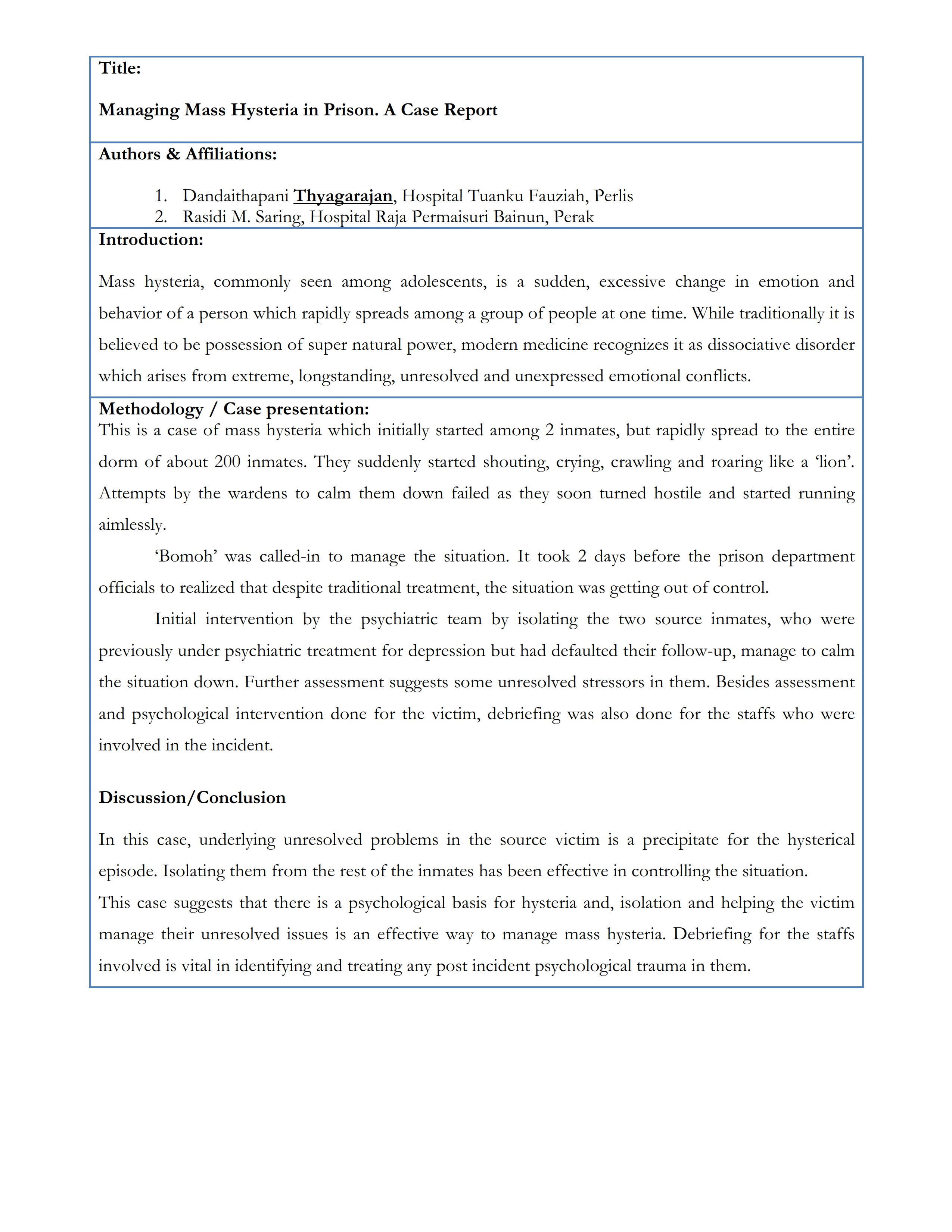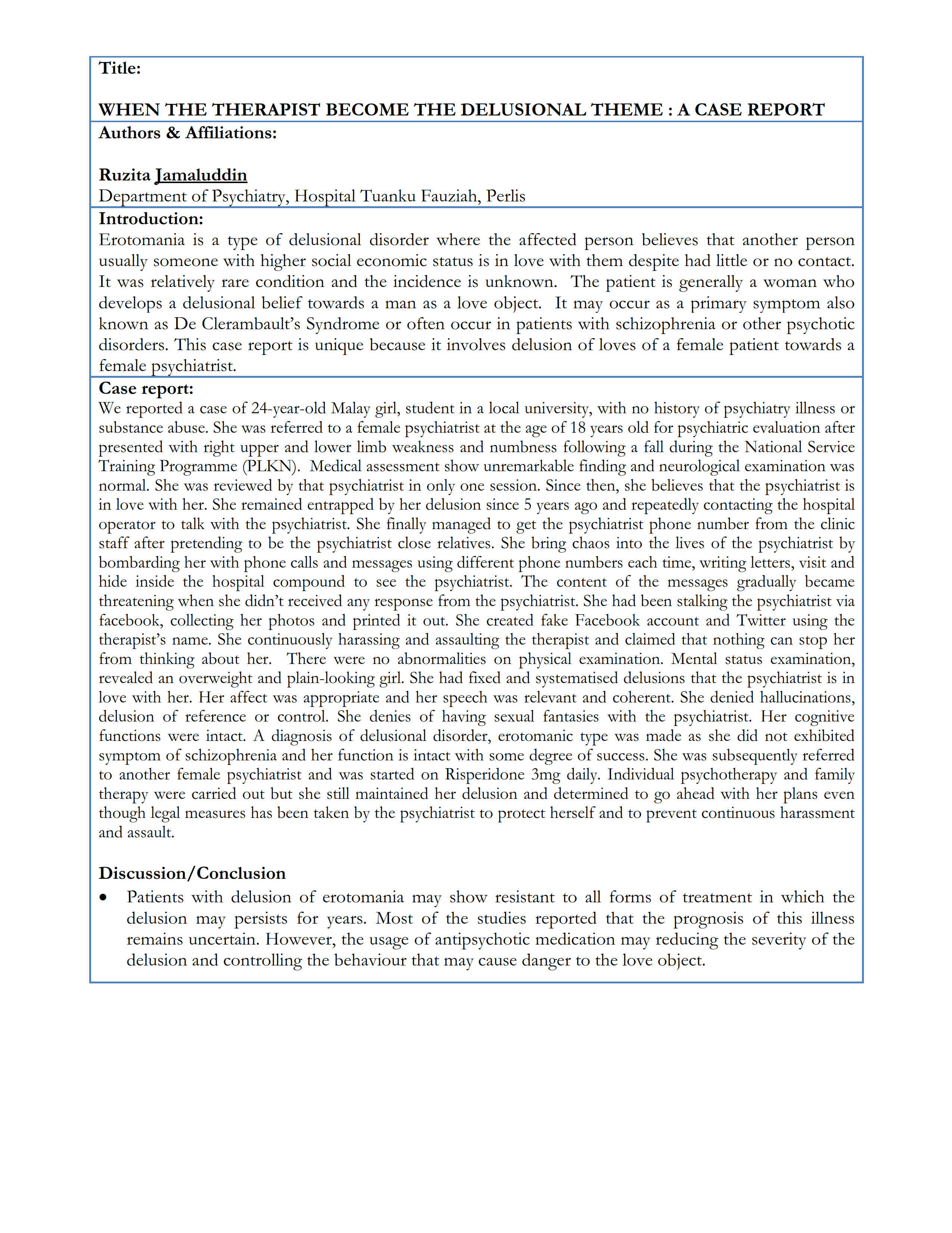Delusional Infestation Successfully Controlled With Typical Antipsychotic Depot Injection: An Illustrative Case Report (pautan free-access sehingga 7 April 2018) |