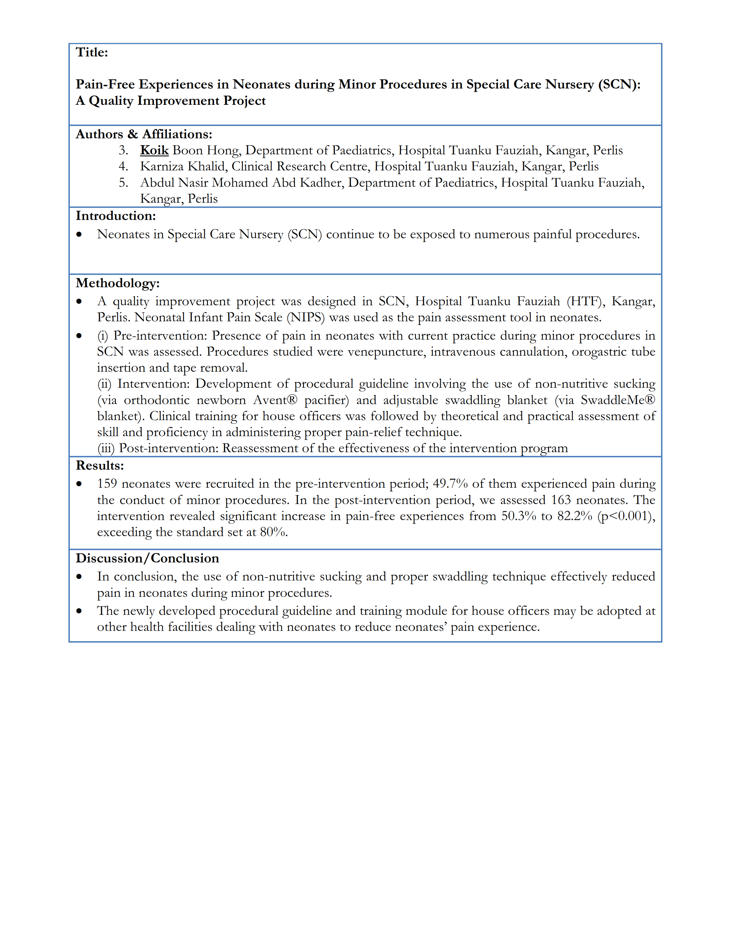 Pain-Free Experiences in Neonates during Minor Procedures in Special care Nursery ( SCN ) : A Quality Improvement Project |