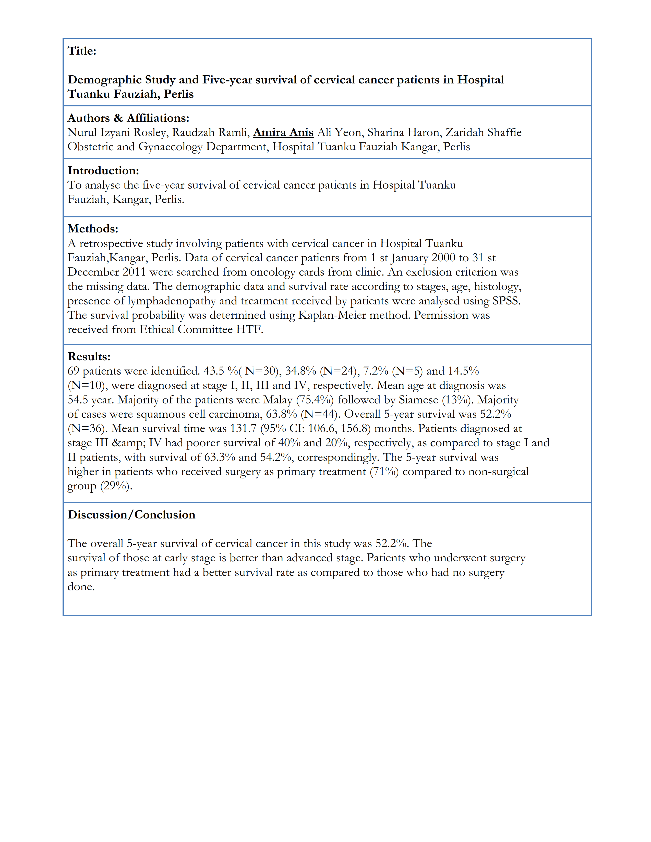 Demographic Study and Five-Year Survival of Cervical Cancer Patients in Hospital Tuanku Fauziah, Perlis |