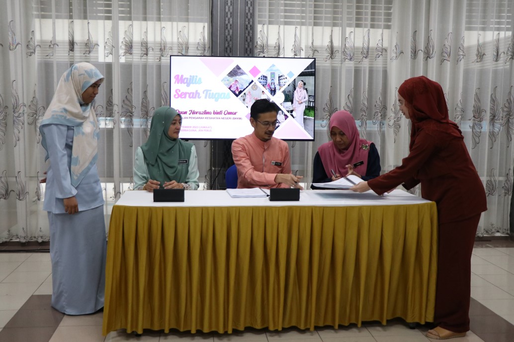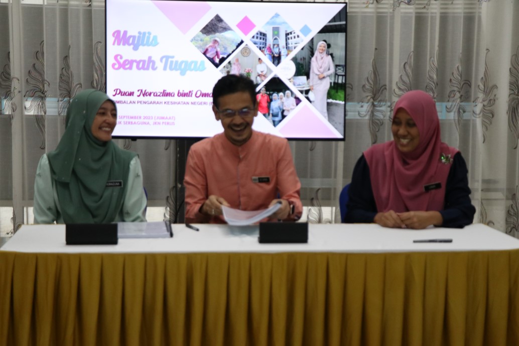 Majlis Penyerahan Nota Serah Tugas Timbalan Pengarah Kesihatan Negeri Perlis (BKKM), Puan Norazlina binti Omar kepada Ketua Penolong Pengarah (BKKM), Puan Linza binti Md Yassin telah diadakan secara ringkas di Bilik Serbaguna, Kompleks Ibu Pejabat Jabatan Kesihatan Negeri Perlis. Majlis ini telah disempurkan oleh Pengarah Kesihatan Negeri Perlis, YBrs. Dr. Ismuni bin Bohari.